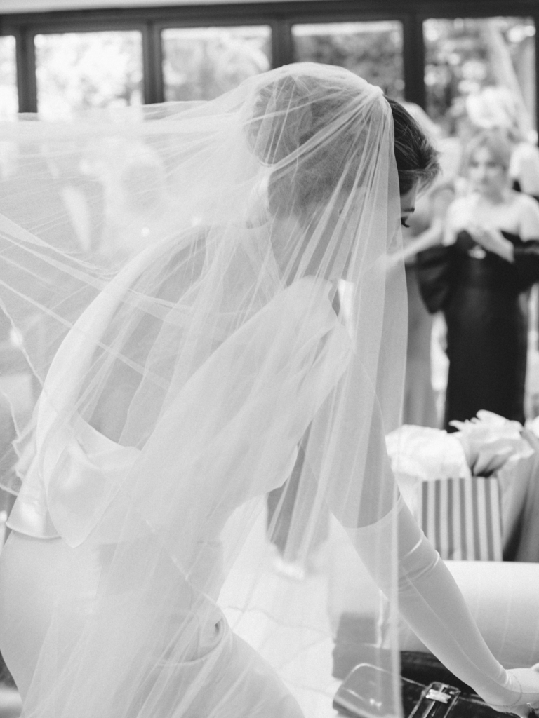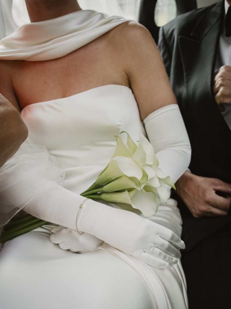 I like my jewellery like everything else, understated, I opted for a pair of Mejuri drop diamond tennis earrings. On the morning of the wedding one of Josh’s grooms men arrived at my door with a Sophie Breitmeyer bag from my husband to be, in it a golden chain bracelet with a stone that perfectly matched my ring. After sobbing, I wore this over my Cornelia James cream silk opera gloves.