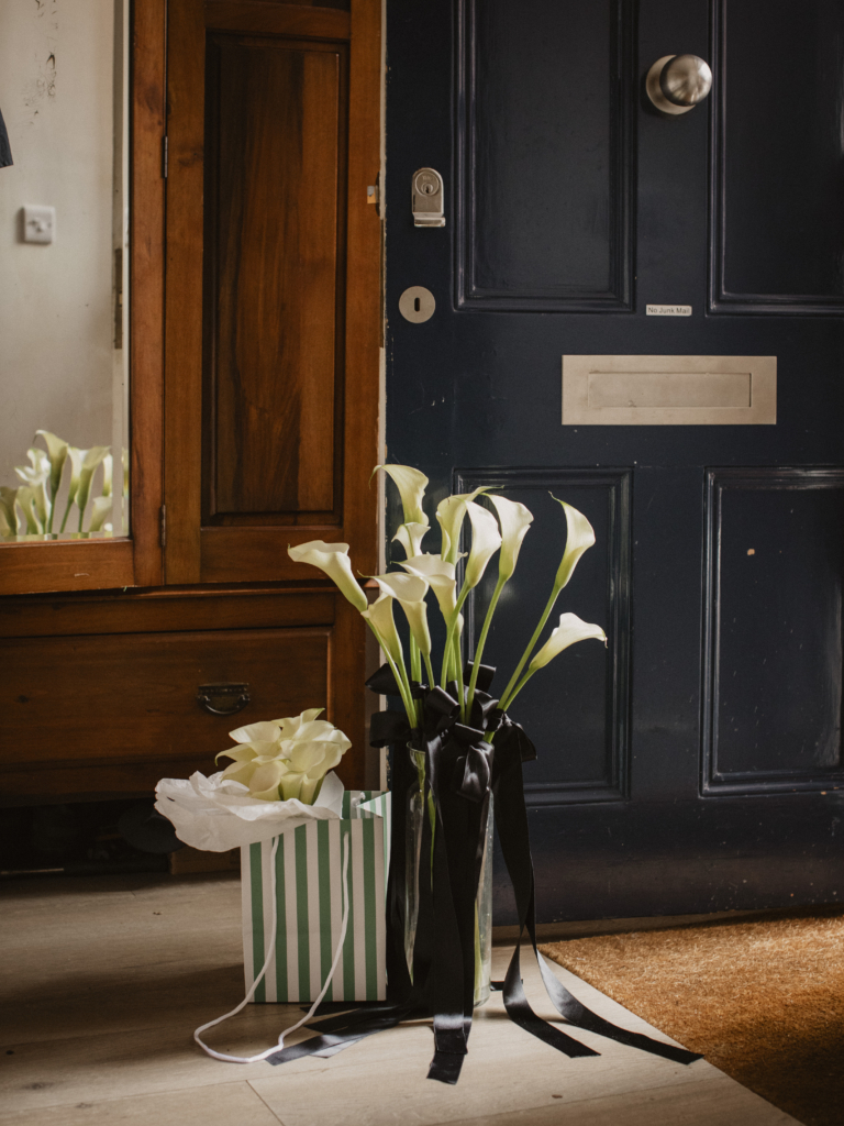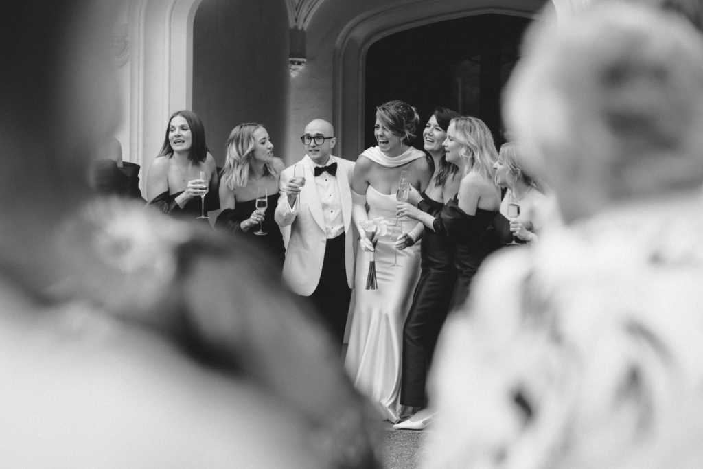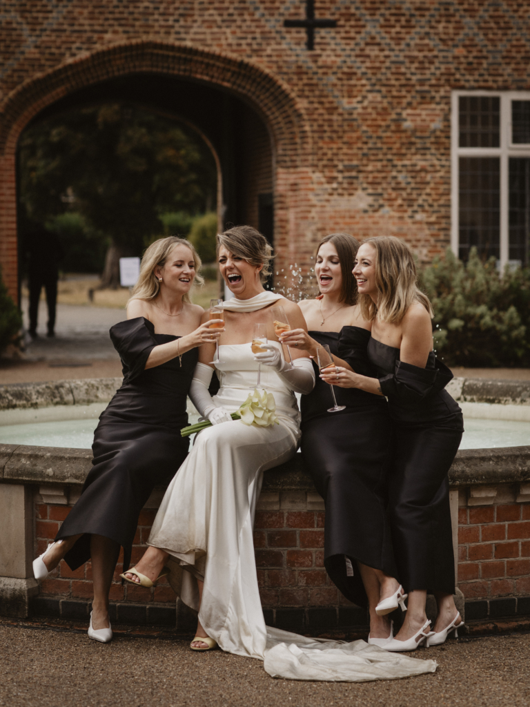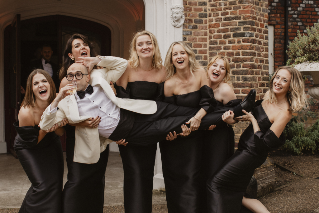 Our groomsmen wore head to toe Marks and Spencer’s tuxedos and the bridesmaids had black dresses from Coast with white shoes from Stradivarius (I was thrilled with how these looked). I gave my bridesmaid each a pair of silk pyjamas in a warm bronze colour from Ghost as a gift and we all got ready in them together.