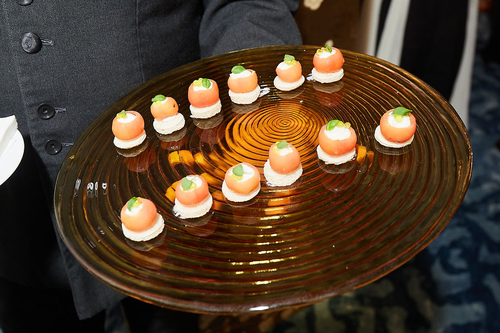 Champagne flowed freely, with glasses of Moët & Chandon served on arrival and throughout the evening, their golden bubbles catching the light as conversation ebbed and flowed. Elegant trays of canapés circulated with quiet precision. From the cold selection, guests enjoyed citrus-infused cherry tomatoes with burrata, olive oil caviar and basil on toast, alongside pear and goat’s cheese, vermouth-glazed, served on sesame crackers. Hot canapés followed, including crispy chicken with miso mayo and scallion, hirate buns filled with Peking duck, spring onion and hoisin, and indulgent bites of fillet of beef Wellington with tarragon emulsion. Mini Yorkshire puddings filled with roast beef and horseradish proved particularly popular, disappearing almost as quickly as they appeared.