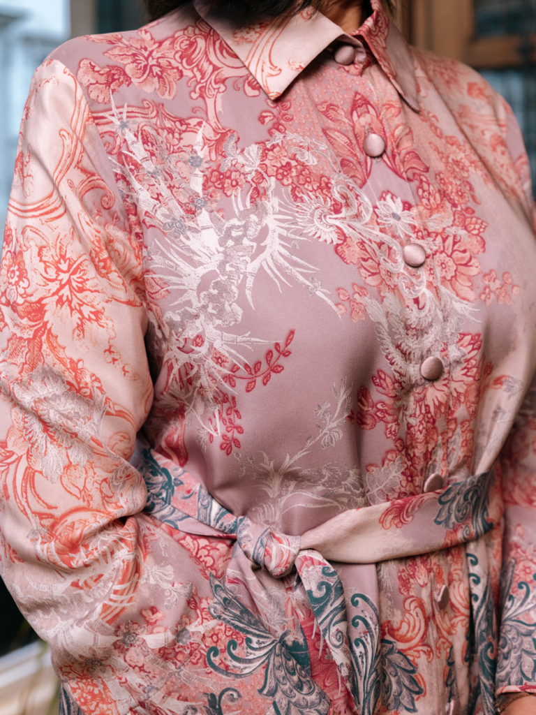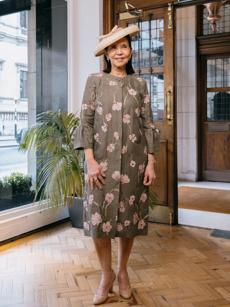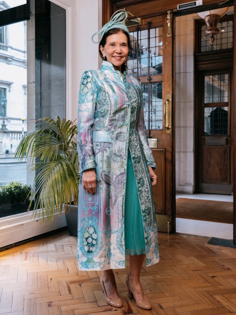 A newer silhouette from Favourbrook: the Oxford is structured enough to befit the occasion but soft enough to wear without thinking about it. Cut from pure Italian azalea silk, printed in Como by a family-owned mill, it moves beautifully, photographs like a dream, and feels extraordinarily light for something that looks so considered. With a design versatile enough to carry a summer garden wedding as comfortably as a formal city celebration, this adaptable piece is explicitly flattering – my mother slipped it on and the difference was instant. For mothers of the bride who want shape and polish without restriction, the Oxford makes a compelling case.