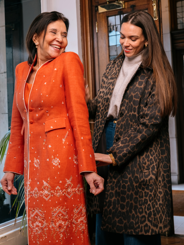 Of everything we tried, the Duster Coat was my mother’s personal favourite. It’s easy to see why: cut from lightweight Kelmarsh linen with a soft, elegant silhouette and a subtly textured finish, it is knee-length, clean-lined, and elongating. And in khaki-bronze, it’s a more interesting choice than the obvious neutrals. Note the detailing too: elbow-length tulip sleeves with ruffled bell cuffs add a romantic, feminine movement to an otherwise composed shape. The ornate appliqué embroidery – floral trails in shades of pink with green stems and leaves – is bespoke to Favourbrook and executed with expert precision. It’s the kind of piece that reminds you what dressing well, at its best, can feel like.