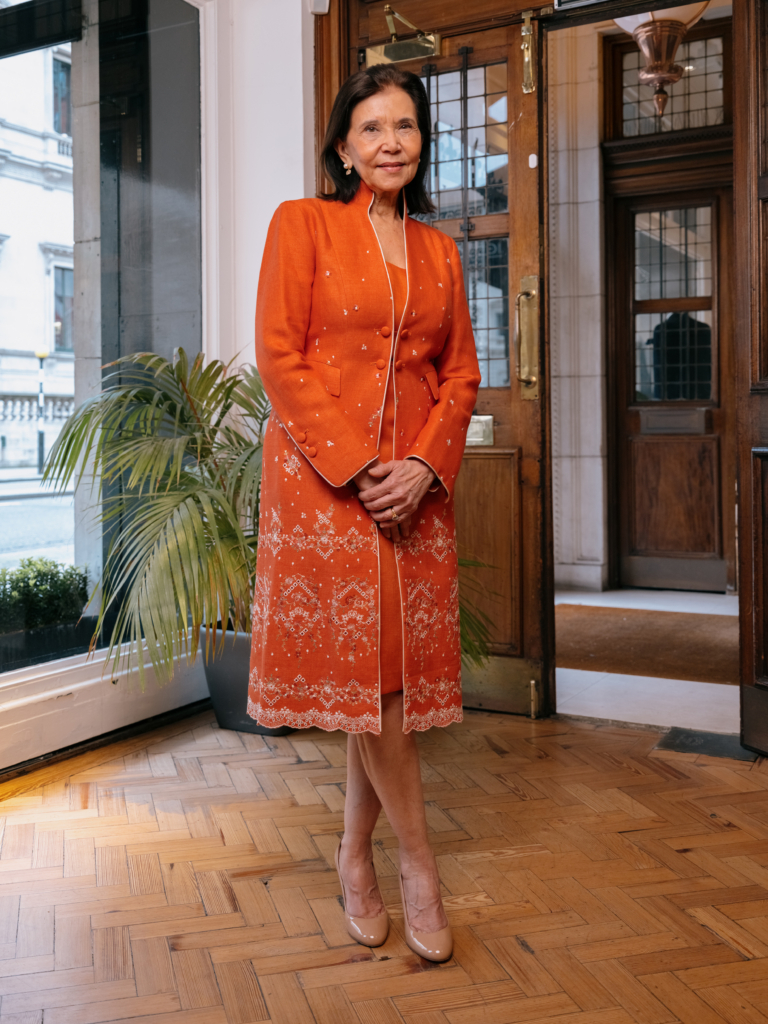 The Eton Coat is a bold proposition, in a vibrant orange crease-resistant linen, grounded by the discipline of its cut. Styled here as a coordinated set with the matching linen dress beneath, my mother was particularly taken with the tailoring. The Austrian linen is crease-resistant, holding clean lines for the duration of the day, with careful bespoke detail in the embroidery, worked in France to Favourbrook’s unique finish. Long, clean and falling below the knee, it elongates without effort and carries the kind of formality that works first at a summer wedding, and then on to Royal Ascot.