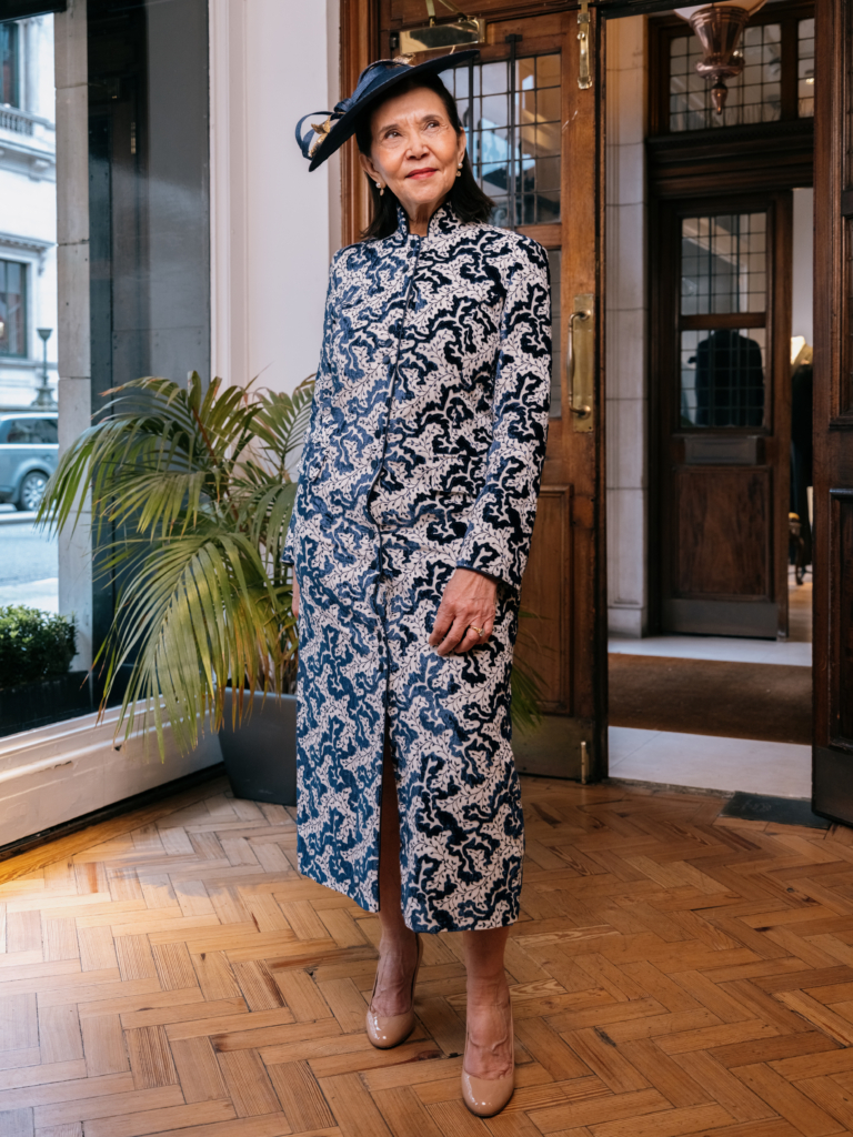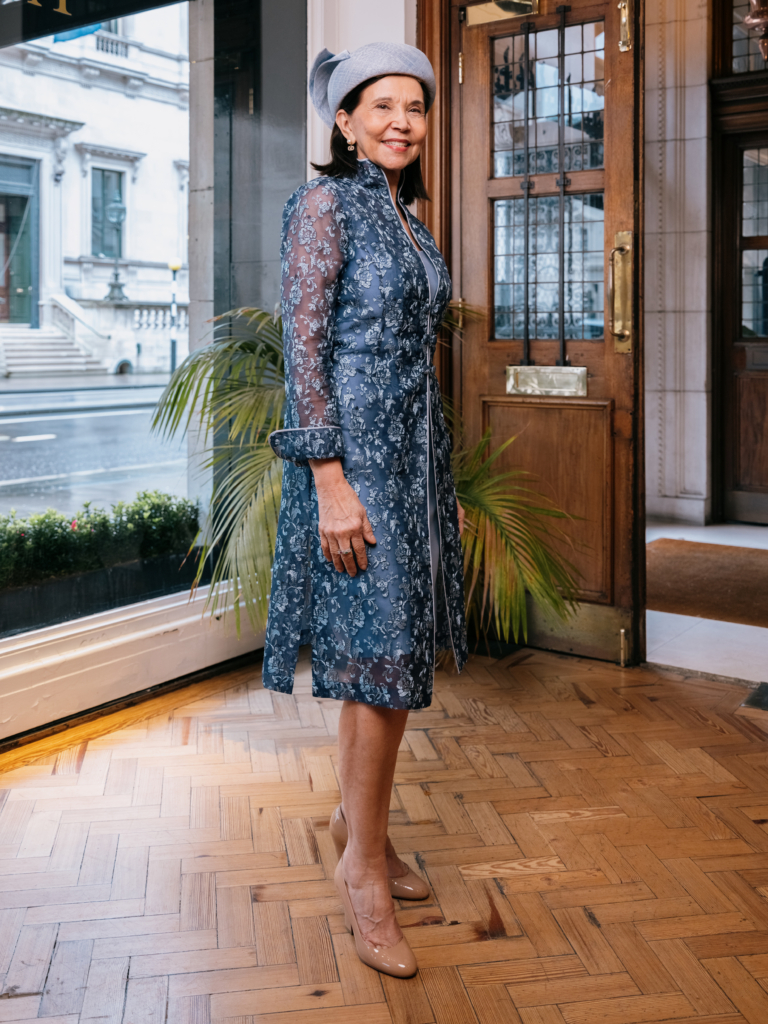 Where the Carnaby makes its presence felt, the Westminster works differently – through feather-lightness, transparency and quiet drama. Styled here over a soft blue silk dress, the embroidery on the coat draws out the colour beneath, and, finished with an Atelier Milinary fascinator, the overall effect is effortless. Cut from fine embroidered silk organza, sourced from France, it adds polish and occasion, moving with a beautiful fluidity. For a summer wedding where you may want coverage without a heavy feel, this is the considered choice.