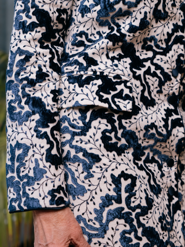 The Carnaby Coat is a statement without trying too hard. The garment is cut straight, skimming rather than clinging, giving it an elongating effect. The open front keeps it light and graceful, and easy to wear all day. The fabric is a high-quality linen blend, breathable and substantial in equal measure: a natural choice for a spring or summer wedding. The piece is elevated further with velvet appliqué motifs embroidered in a subtle metallic navy yarn, a nod to Favourbrook’s English craftsmanship. This is, without question, an heirloom piece, and for my mother, an instant frontrunner.
