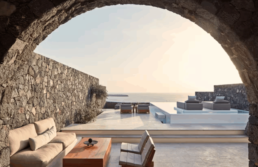 A new kind of Greek escape where wild Peloponnesian beauty meets Mandarin Oriental finesse – think olive groves, sleek suites, and a salt-licked breeze from the Ionian Sea. From the moment guests step into the vaulted, sun-drenched lobby with its sculptural lighting and olive-wood accents, it’s clear this isn’t your standard resort. The communal spaces hum with low-key confidence – wide-open interiors in creamy stone, monastic corridors softened by sisal rugs and mid-century furniture, and floor-to-ceiling glass framing the silver-green landscape beyond. The crowd is elegant but not showy, with a quiet style that’s unmistakably continental.
