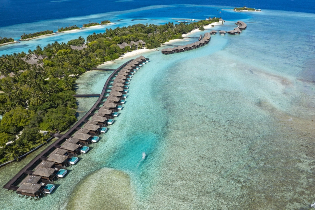 As the seaplane smoothly touches down on the ethereal blue waters around this Northern Atoll spec of green and white, couples can expect a somewhat lively welcome. Traditional drums line up along the jetty, along with staff holding fresh coconuts. Then it’s a scenic golf buggy ride to the villas, winding through tropical greenery, with mature coconut palms soaring amongst sculpted orchids (there is a dedicated orchid garden here) and many native jungle plants. The architecture feels reverential in places and more bold in others, with striking thatched buildings dotting the island – think triple-height vaulted ceilings and ebony-shaded structures. Honeymooners can tap into the many gurus at the resort. We recommend a date with the Sky Guru based at the impressive observatory, where you can name a star and register it to mark the occasion.Â