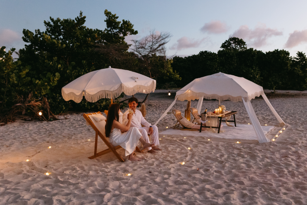 Eagle Beach remains one of the island’s most romantic settings, particularly as the sun begins to drop and the sand glows softly beneath the fading light. Experiences such as Cabana Sunsets create a beautiful setting for the moment, with lantern-lit cabanas arranged directly on the sand and couples enjoying a private dinner as the sky fades slowly into the evening.