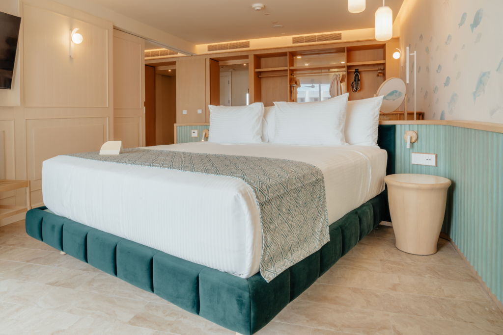 One of the most impressive spaces is the bridal suite, a large, light-filled room designed for the hours before the ceremony. It’s the kind of space where the morning unfolds slowly: champagne glasses on the table, music drifting softly through the room, and bridesmaids moving between mirrors and balconies while the Caribbean stretches out beyond the windows.