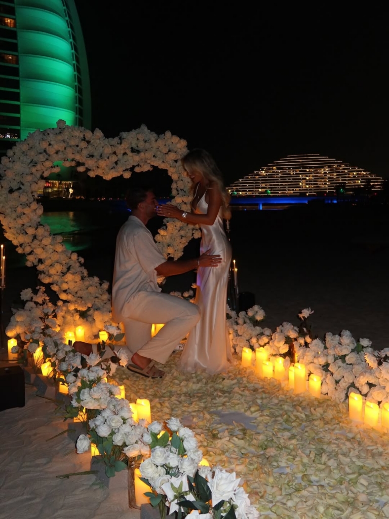 When the moment finally came, Tom chose Dubai as the setting. The proposal took place on the beach at night, where he had quietly arranged the most romantic scene. A violinist played softly nearby while flowers framed the shoreline, creating something that felt cinematic yet completely personal to them.