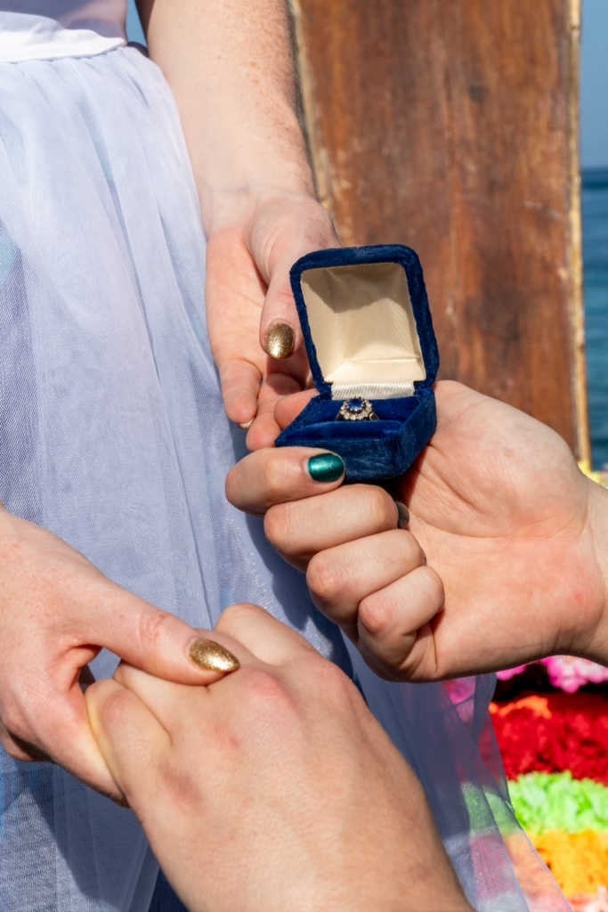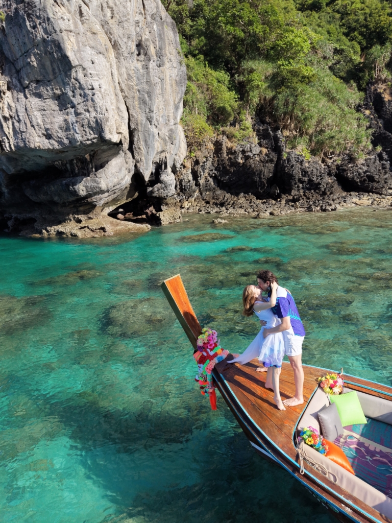 We met our planner/photographer in the little down town on Phi Phi island. She took us to a private traditional long tailed Thai boat that was rented exclusively for us. She gave us a speaker and told us we could play music. Tariq played the song he wrote, recorded, and published for our one year anniversary Hold Your Ghost. It’s about our love lasting beyond death. We toured around these beautiful cliffs that just drop into the ocean. We pulled into a beautiful cove with large cliffs and crystal clear water. The photographer said we would take some pictures and drone shots here. She had us pose together for some. Which I was thinking was silly to take them before we got engaged. Then she said Tariq was going to do individual shots. And he did. And then me. She had me sit on the side of the boat and said to look over at the cliff. Then Tariq came up beside me and bent down on one knee. He said “it’s hard to put into words just how much I truly love you, but I plan to spend every day of the rest of our lives showing you, will you marry me” of course I said yes right away. It was a really beautiful and loving moment I will cherish forever.