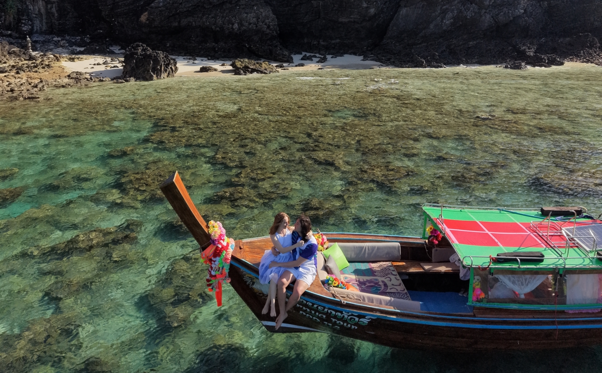 We met our planner/photographer in the little down town on Phi Phi island. She took us to a private traditional long tailed Thai boat that was rented exclusively for us. She gave us a speaker and told us we could play music. Tariq played the song he wrote, recorded, and published for our one year anniversary Hold Your Ghost. It’s about our love lasting beyond death. We toured around these beautiful cliffs that just drop into the ocean. We pulled into a beautiful cove with large cliffs and crystal clear water. The photographer said we would take some pictures and drone shots here. She had us pose together for some. Which I was thinking was silly to take them before we got engaged. Then she said Tariq was going to do individual shots. And he did. And then me. She had me sit on the side of the boat and said to look over at the cliff. Then Tariq came up beside me and bent down on one knee. He said “it’s hard to put into words just how much I truly love you, but I plan to spend every day of the rest of our lives showing you, will you marry me” of course I said yes right away. It was a really beautiful and loving moment I will cherish forever.