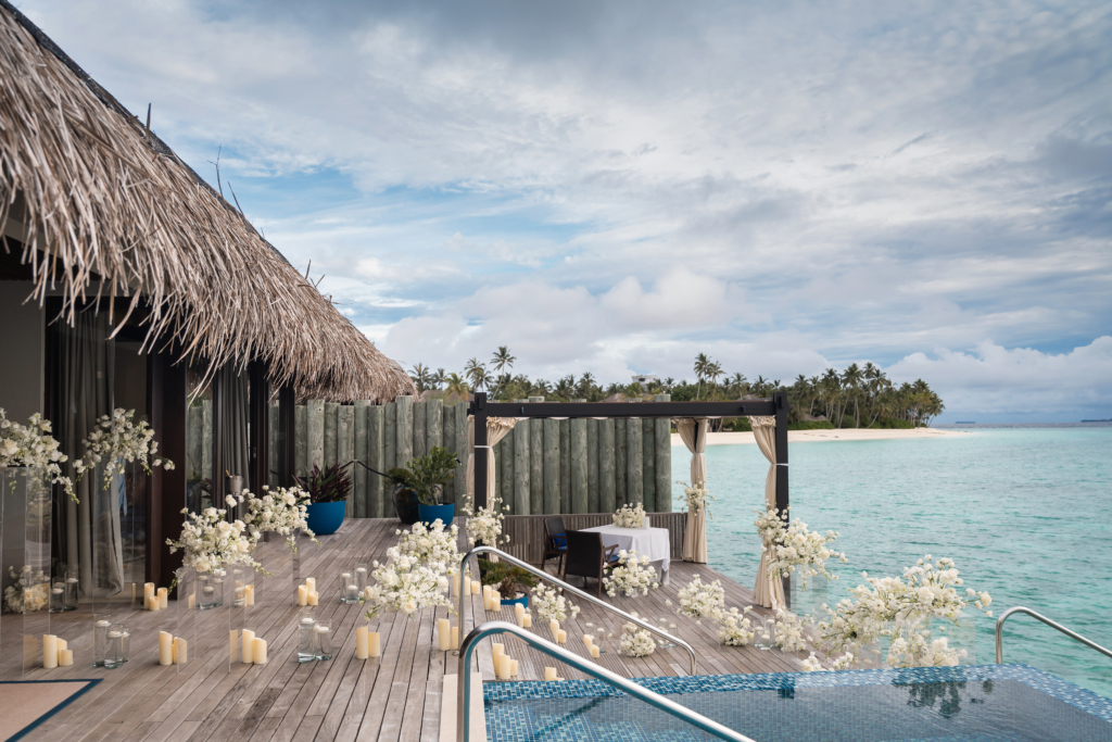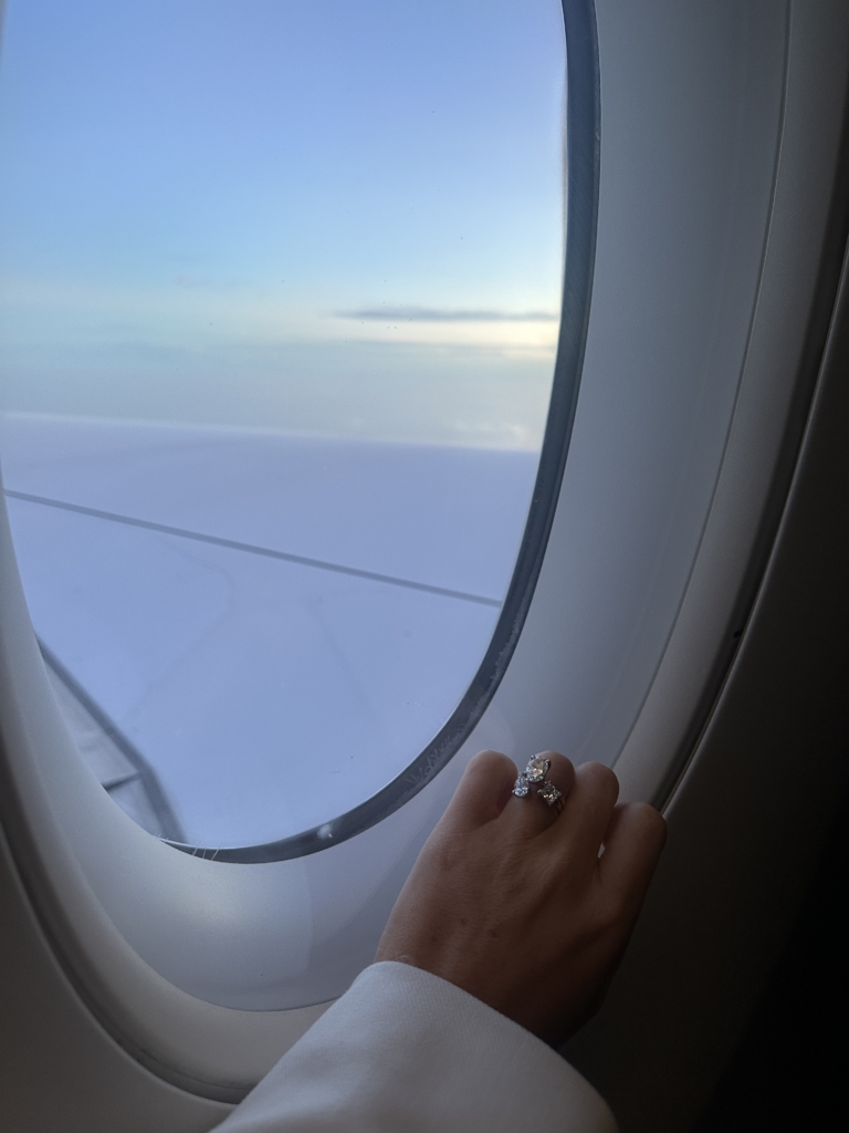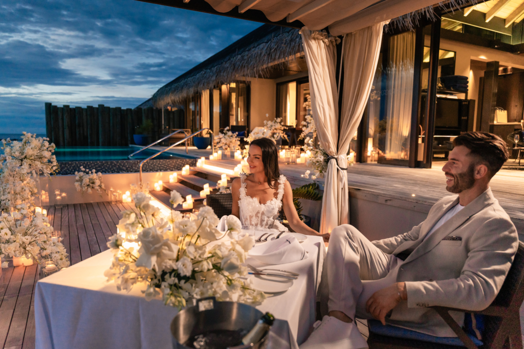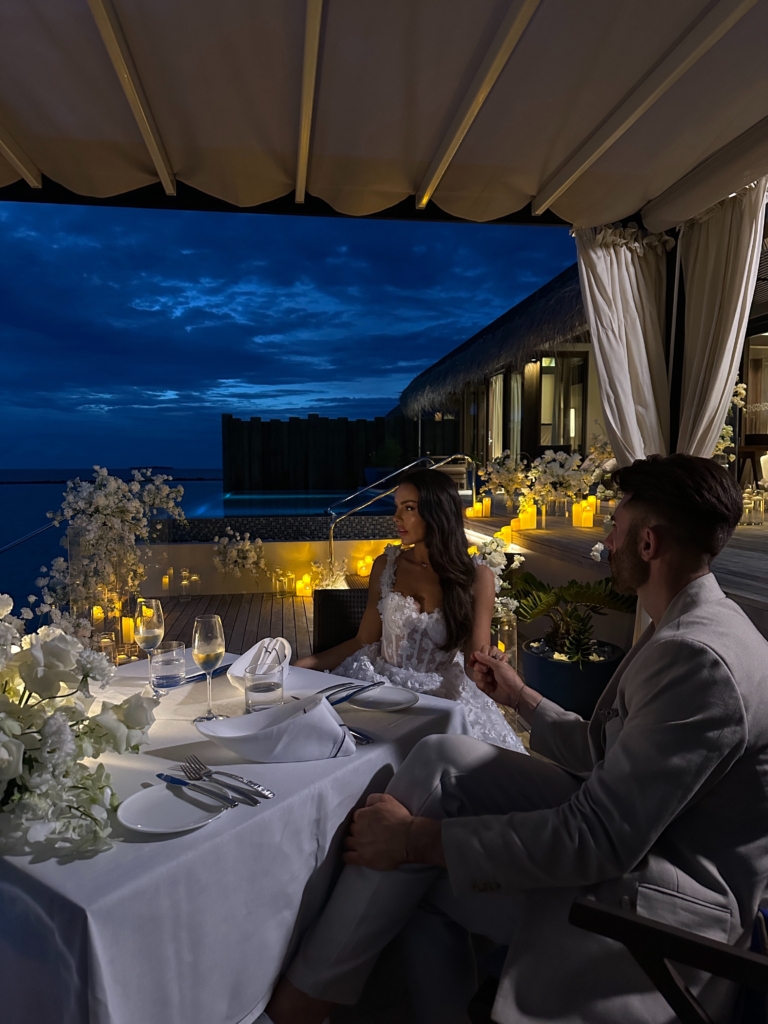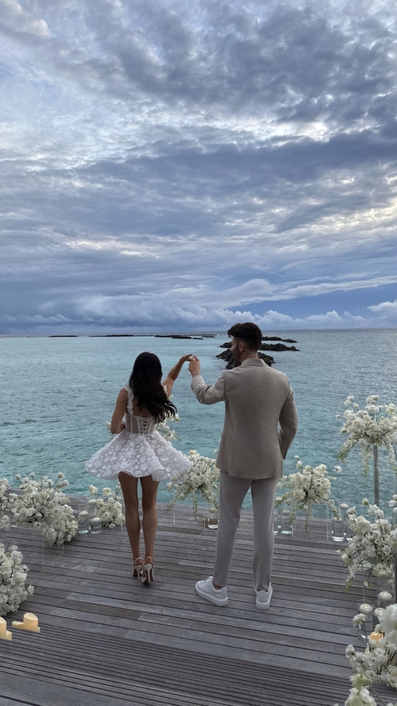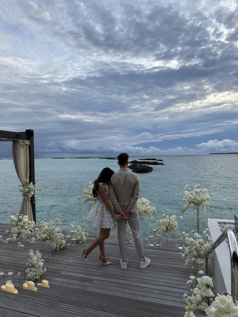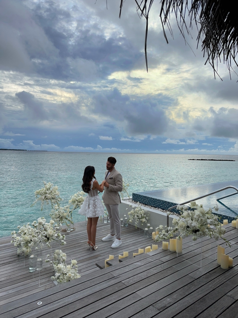 It was like something out of a movie. I don’t think I’ve ever been happier or felt more in love. We were in the Maldives, staying at the breathtaking Velaa Private Island. On 17 December 2024, I was told to be ready at a certain time and to look extra special. Our butler picked me up and took me to a private sunset villa on the water, where the doors opened to reveal a sea of white flowers and flickering candles, with my soon-to-be fiancé waiting for me at the bottom of the steps. I couldn’t stop shaking and barely remember the words spoken, but I know I said yes. We spent the evening dining privately and dancing under the stars surrounded by flowers and candlelight. I never wanted the night to end.