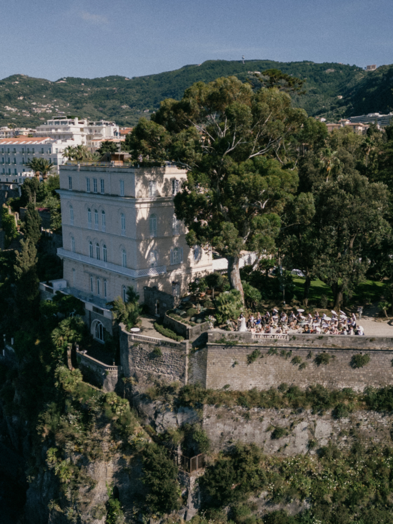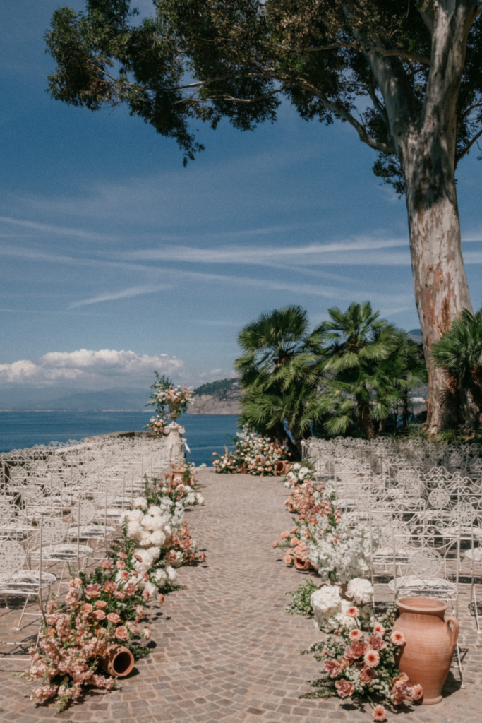 Sorrento’s Villa Astor features an aisle at the end of a cliff, set in the volcanic backdrop of the Bay of Naples. For Chloe and Chris’ wedding, they dotted the cobblestone aisle with roses and terracotta pots. Dive into their wedding here.