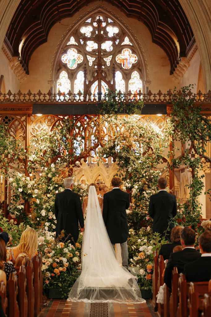 Honour and Charlie got married at a lovely Hampshire church, decorating the altar with immersive, winding greenery and seasonal summer flowers. Quintessentially English wedding inspiration here.