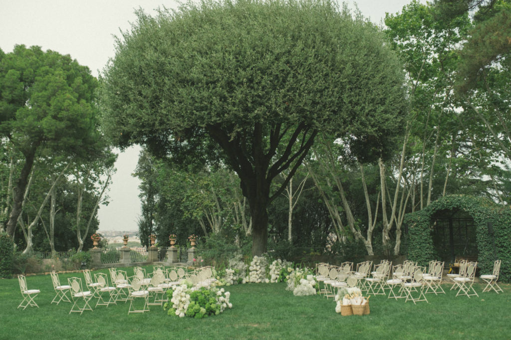 Under the shadow of an evergreen oak tree, Valeria and Artem exchanged vows in a simple garden of Villa-Aurelia, a 17th century baroque estate in Rome. Find out more about their wedding in the Eternal City here.