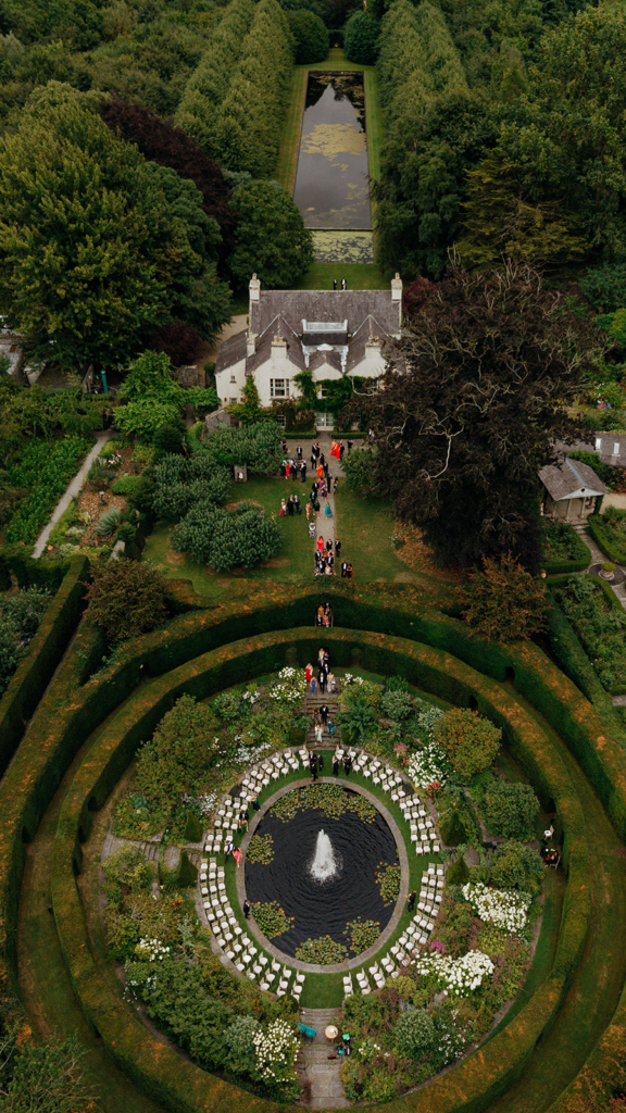 Charles and Matt got married on the steps of the walled garden in Ballintubbert Garden & House in Co Laois. Guests were positioned in the round, circling a central lily-pad pond. More on their Irish wedding here.