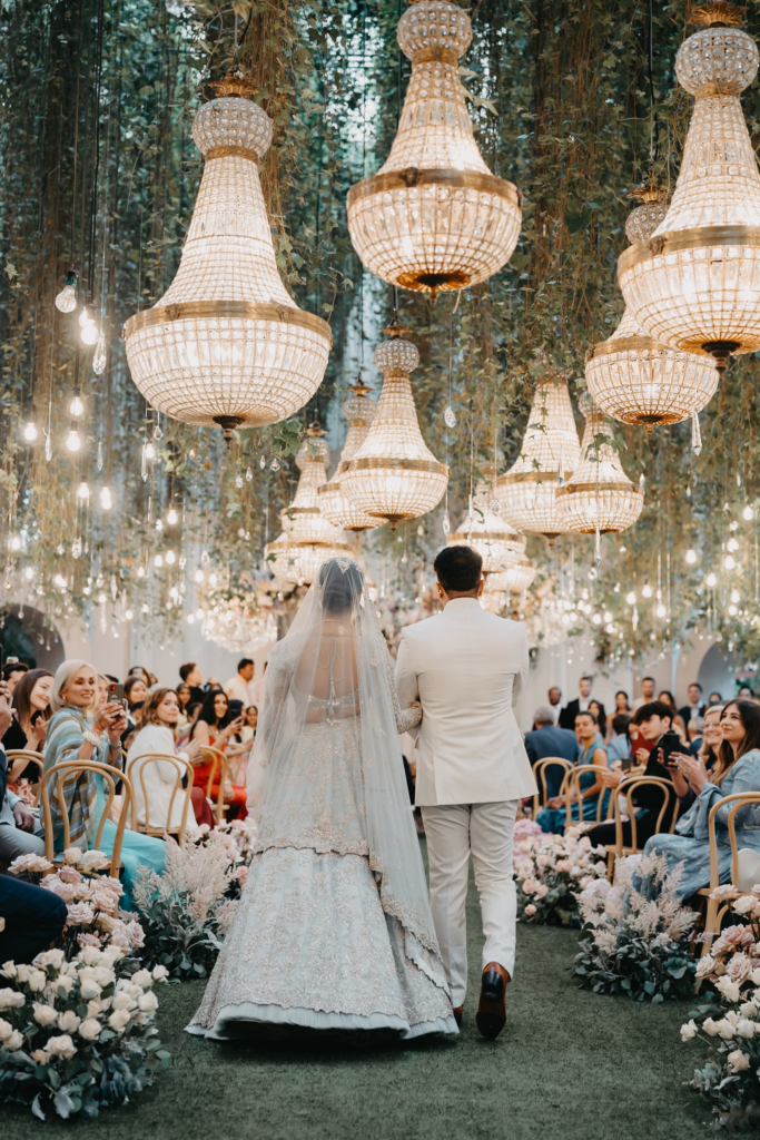 Megha and Valentin chose a Portugese tropical estate, aptly named Swan Lake, for their epic multi-day celebration. Megha walked down the aisle under an immersive canopy of chandeliers and hanging green vines – read more about their multicultural wedding here.