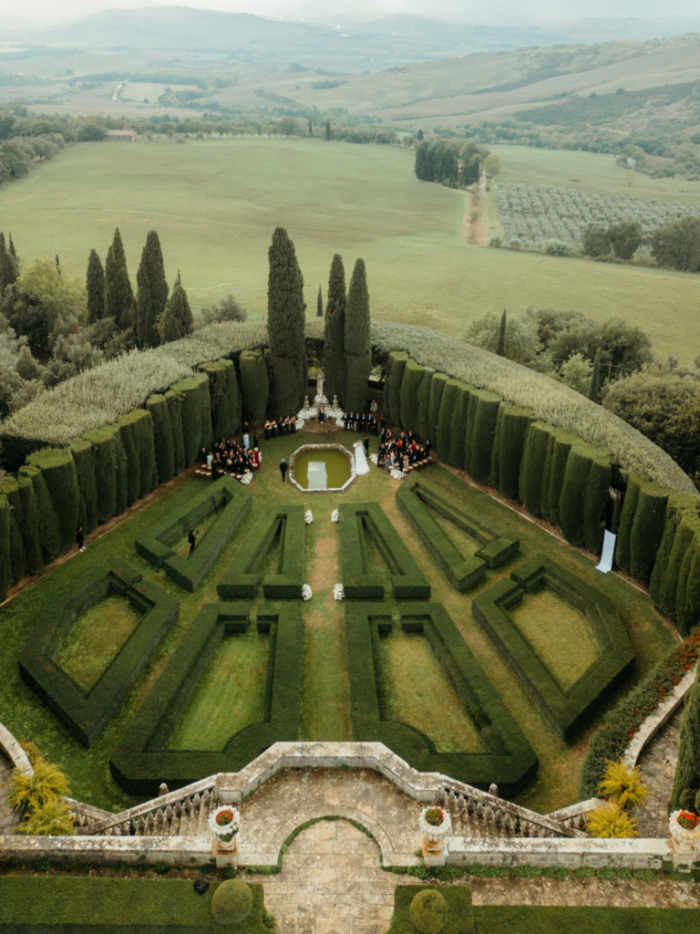 This UNESCO-heritage Tuscan estate, La Foce, was the epic setting for Haya and Sunny’s wedding. The gardens were designed by Iris Origo and Cecil Pinsent, a naturally high-drama backdrop for the bridal party procession. Explore their Val d’Orcia wedding here.