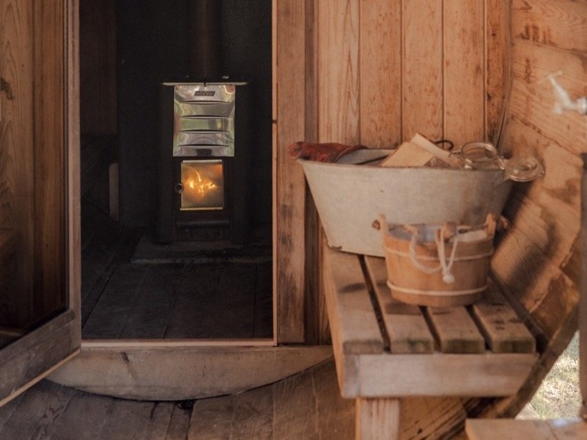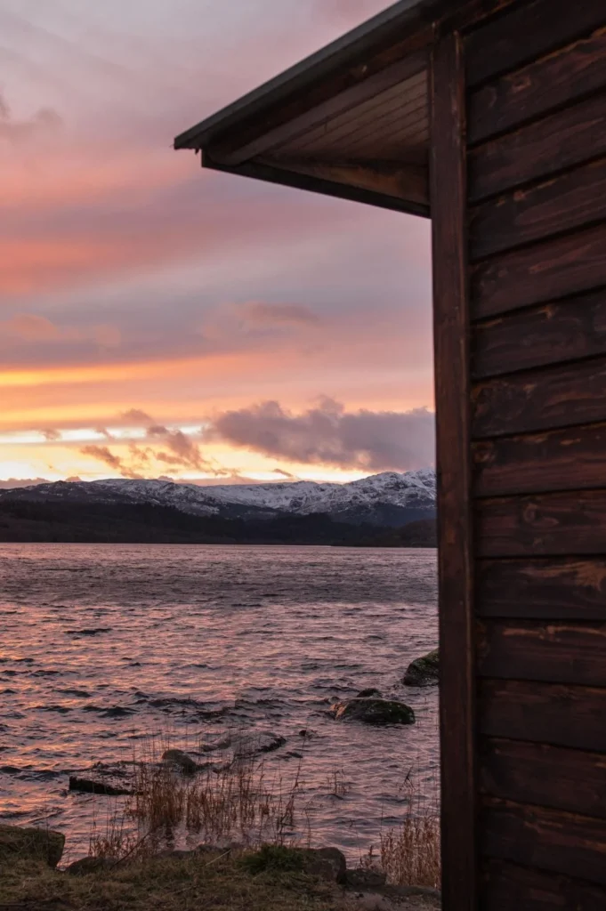 Near Callander, Venachar Lochside has positioned its Finnish sauna directly on the shores of Loch Venachar – a large picture window at the back frames sweeping views across the water to the surrounding mountains. The ceremony itself can be held loch-side, mountain-backed, with the water as an uninterrupted natural backdrop. But either side of celebrations, guests can visit the wild spa, alternating between the sauna and two cold-water options: the dedicated red-cedar cold plunge maintained at a steady 3°C, or the loch itself for wild swims. Sessions can be booked as mixed groups, private hires, or full-day takeovers for wedding parties (up to 50 guests with ten in the sauna at once).