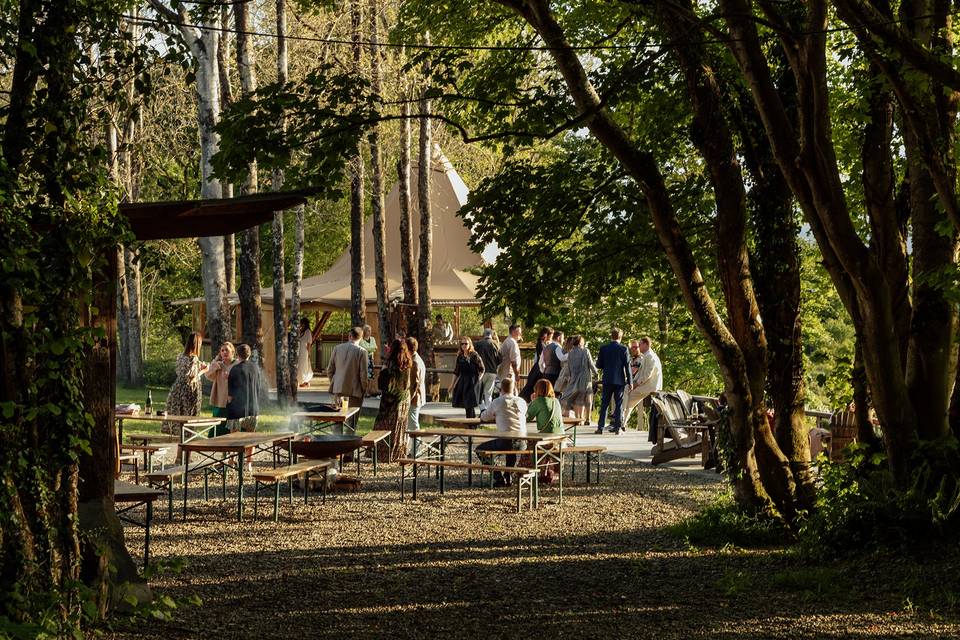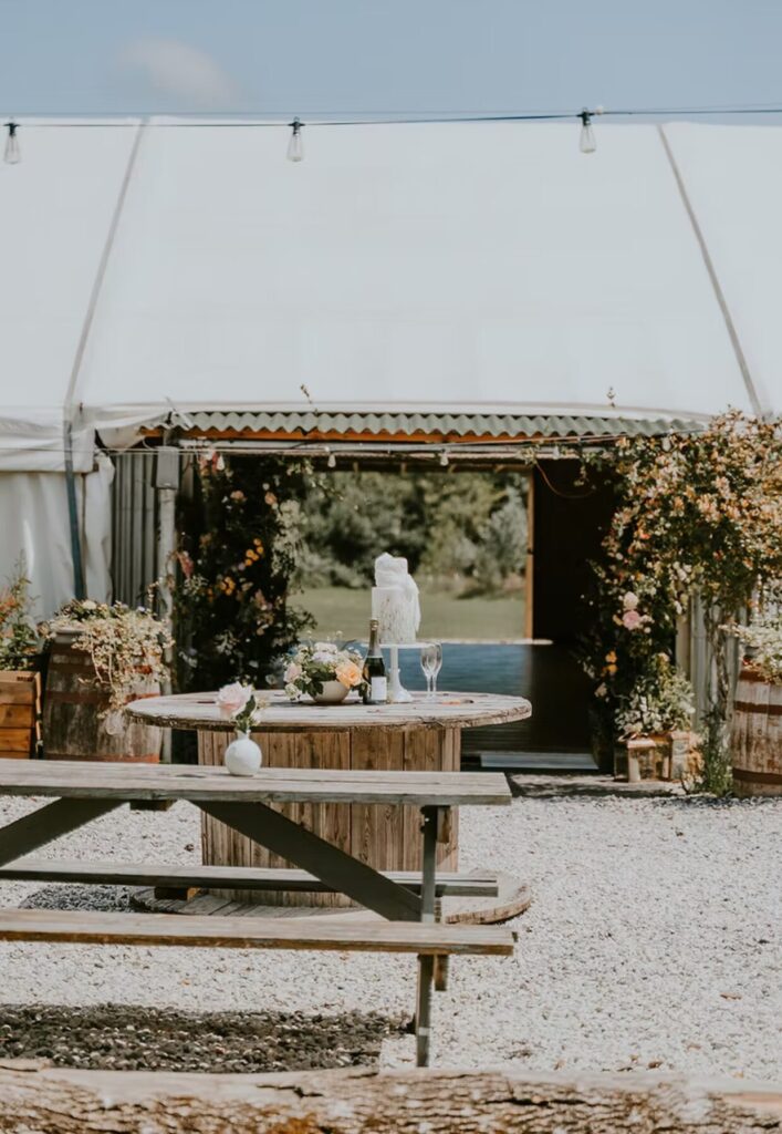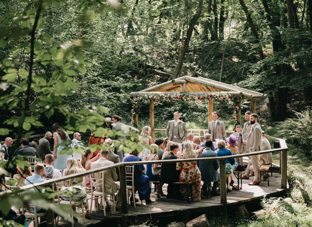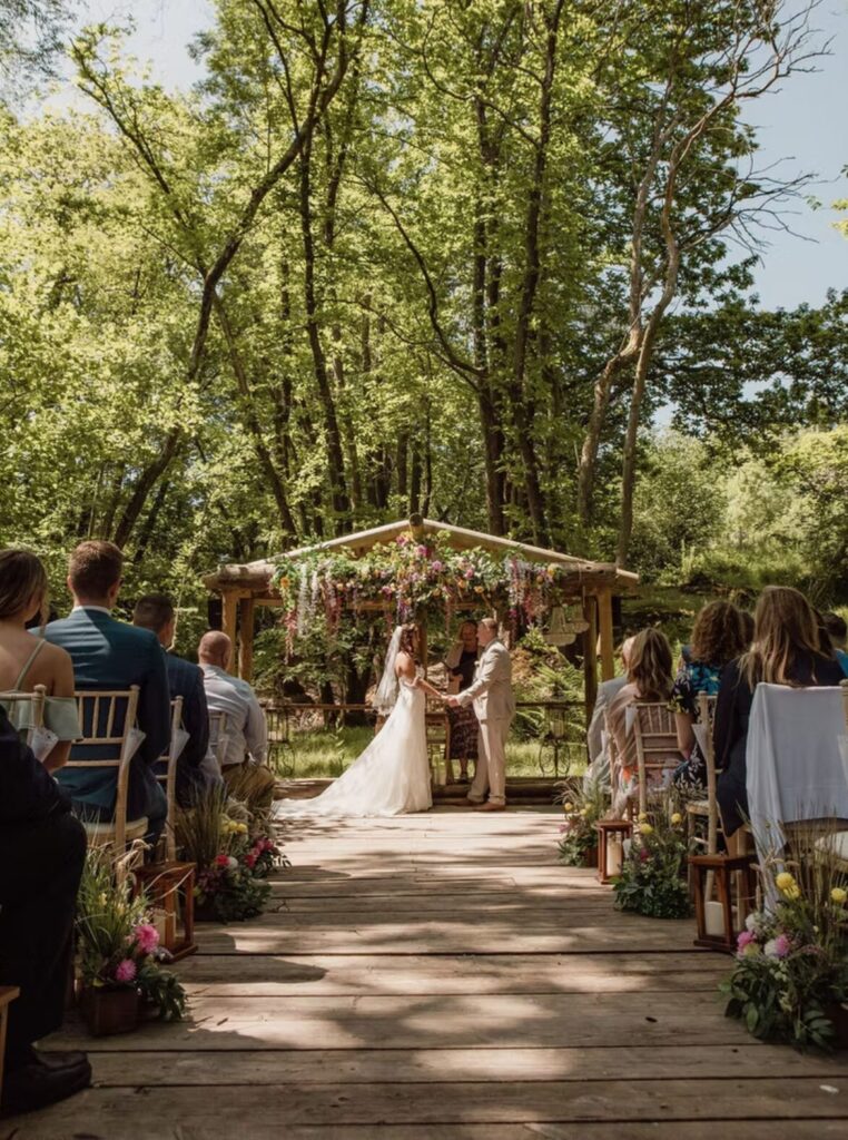 Moonacre sits within five private acres near Sturminster Marshall, run by a holistic therapist who treats wellness and environmental stewardship as inseparable. The venue’s infrastructure adapts to whatever practice couples want to put on the itinerary: a wildwood platform for dawn yoga, a wooden teepee for sound baths, marquee space for larger sessions, a treehouse and a shepherd’s hut for one-to-one work. Emphasis on flexibility and nature immersion rather than prescriptive packages. It’s a family-run venue where community care and ecological grounding inform decisions – carbon offsetting through continuous tree planting, renewable energy, natural light and ventilation in place of artificial systems. Wellbeing is treated as something that extends to the land itself.