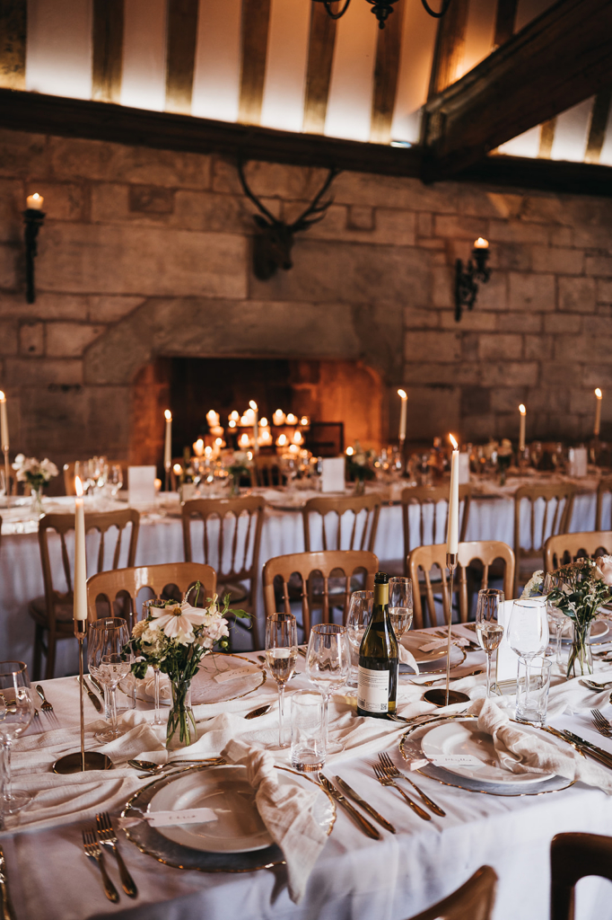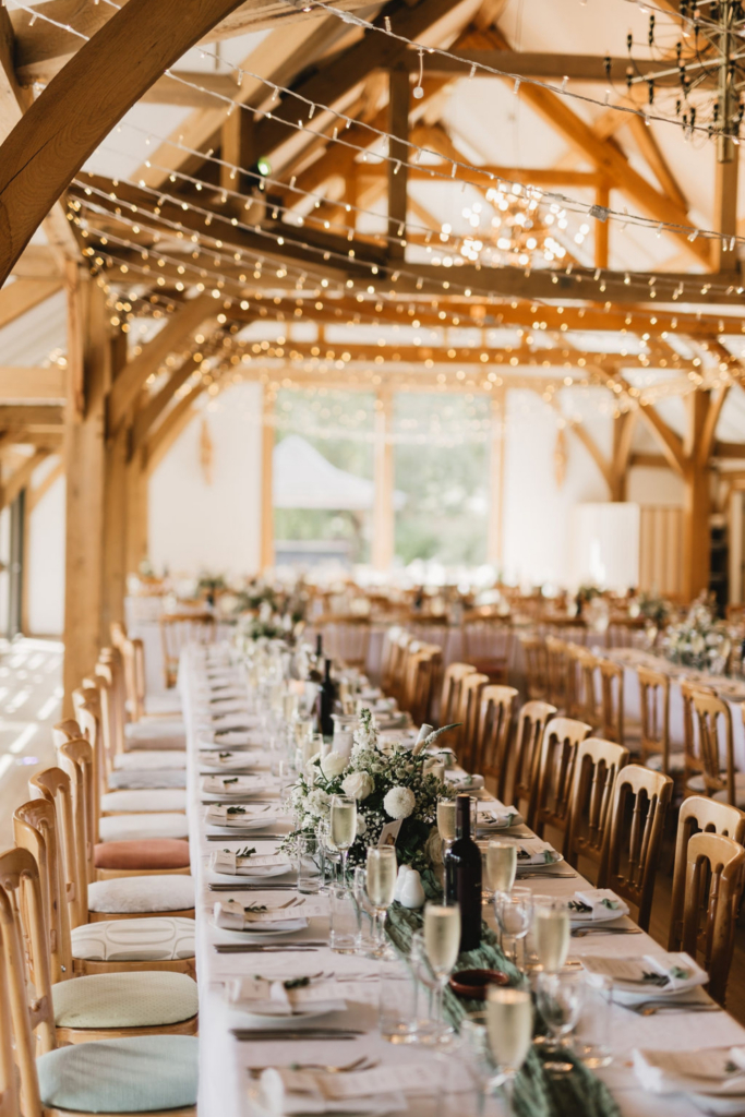 The wedding breakfast itself is served at long tables laid with silver glassware and hurricane vases; the food is hearty, seasonal and generous with all the heavy hitters you might expect, from prawn cocktail to beef wellington or salmon en croute and lemon tart (though menus can be tailored or made fully bespoke to the couple). Three kitchens serve the estate, ensuring all guests – whether in the manor, the barn, or the cottages – are well accommodated.