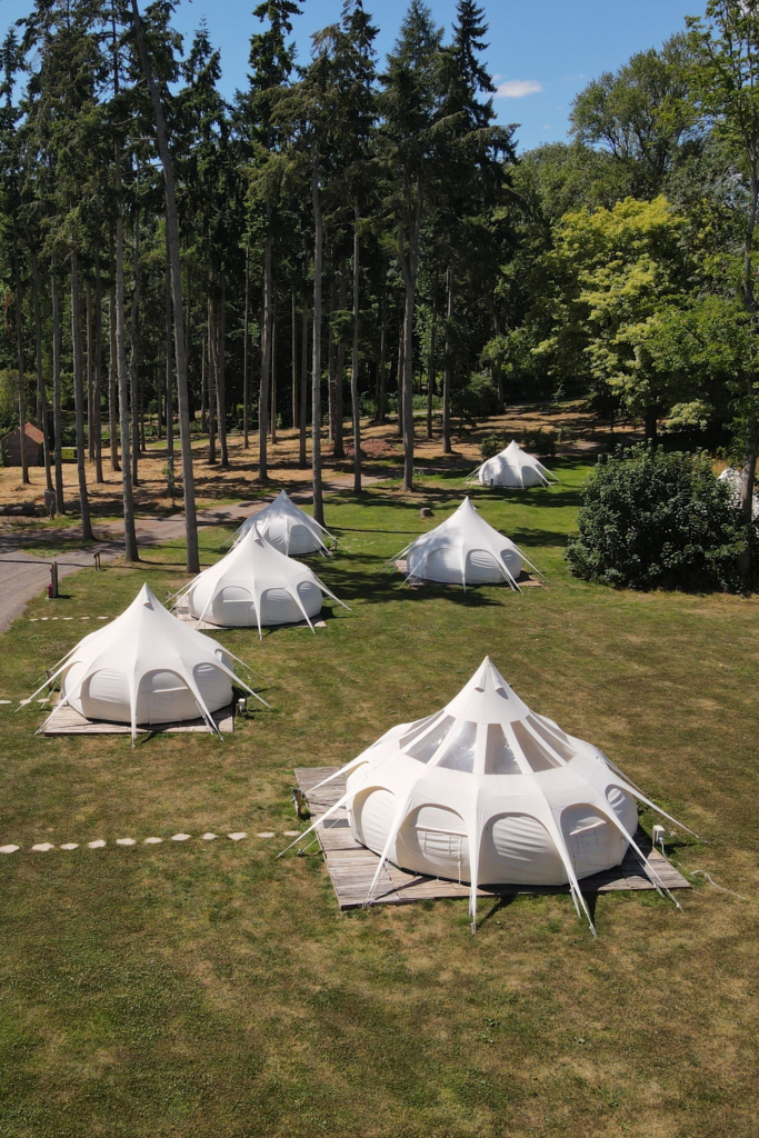 For guests, two cottages extend the overnight offering considerably. Ivy, the estate’s former gamekeeper’s quarters, sits close to the manor with a private terrace, an outdoor hot tub with expansive views towards the Black Mountains, a wood-burning sitting room, a freestanding bath and an Aga downstairs. Wood Cottage, meanwhile, occupies the edge of the estate with beamed ceilings, a wood burner, tear-drop bath and a private terrace facing the Herefordshire hills. For the wider wedding party, 12 glamping tents can be pitched in the ancient woodland, hosting a further 24 guests in Egyptian-cotton comfort.
