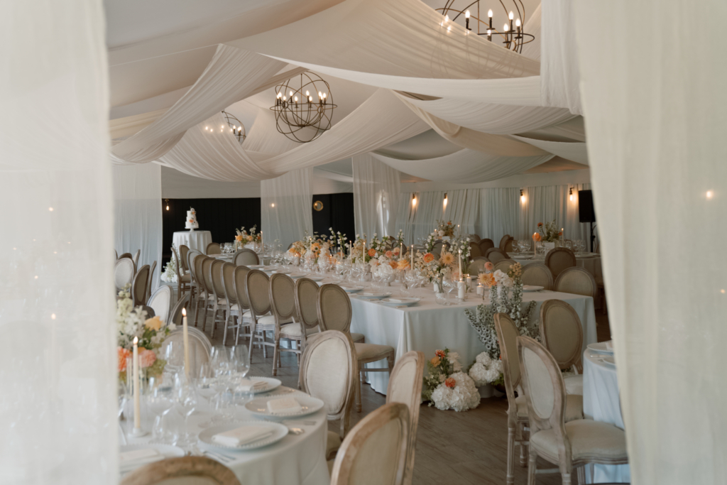 Capacity: Outdoor sail structure (licensed for ceremonies, April–Sept) I50 chairs. Indoor/wet-weather option in drawing room (licensed for I30) optional 50 in adjacent room. The Pavilion party space (seats I50, space for 200).