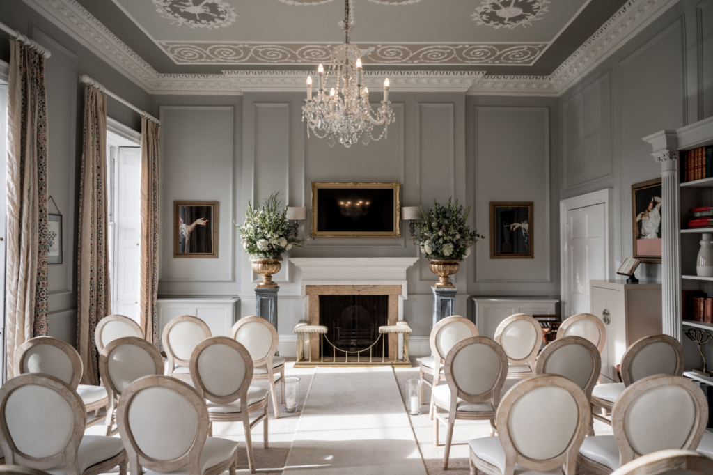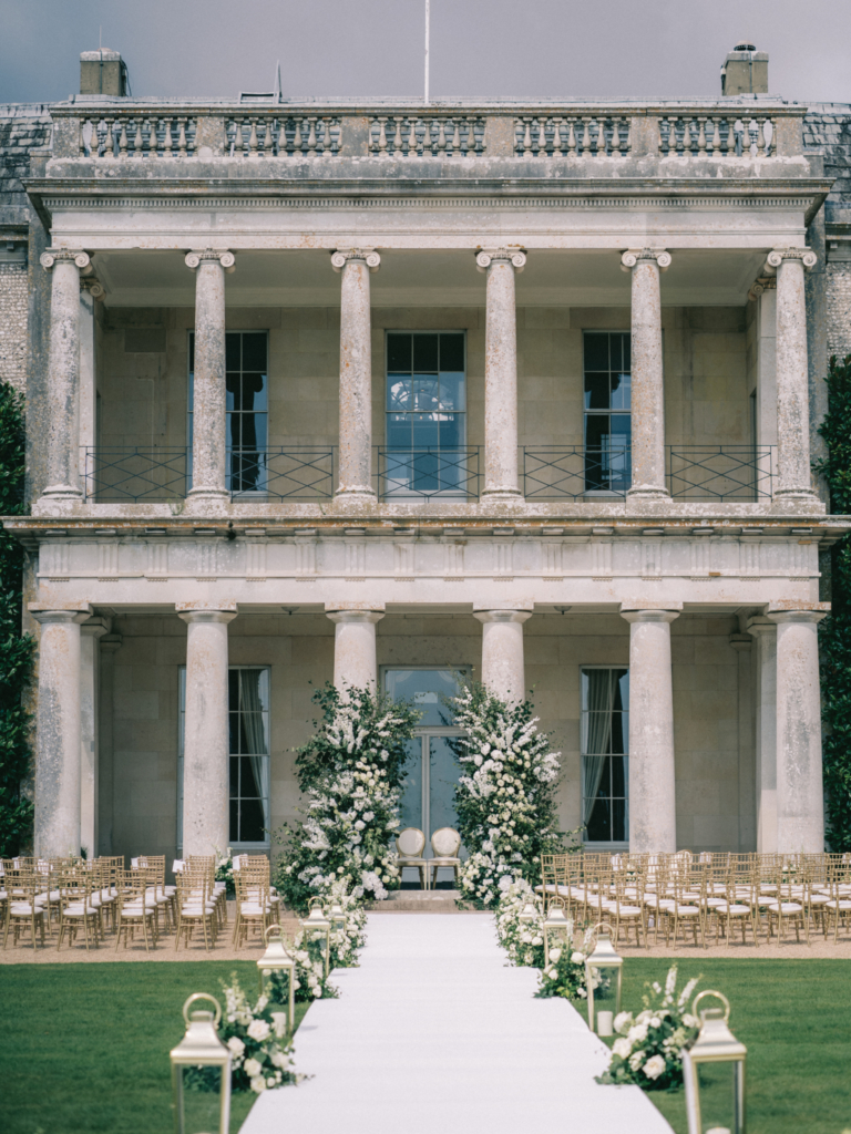 The 11,000-acre Goodwood Estate in West Sussex centres on 18th-century Goodwood House, with ceremonies in historic Georgian interiors: the Drawing Room, receptions in the grand Ballroom, and intimate gatherings in the Egyptian Dining Room.