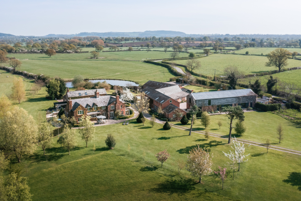 A 17th-century Cheshire estate on 12 acres of topiary gardens, Scarlet Hall hosts ceremonies under the timber-beamed Events Barn, with receptions in marquees, meadows, or orchards and 22 on-site bedrooms.