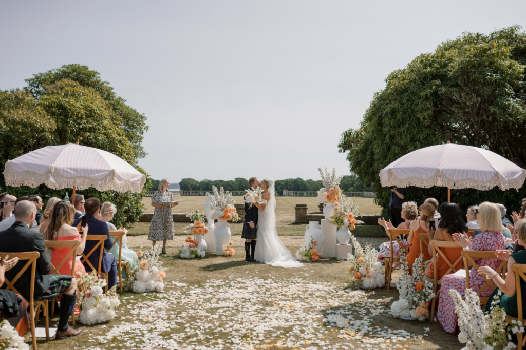 Overlooking the Solent, Pylewell Park offers 58 acres of parkland and private beach access, with ceremonies on the Lawn or beneath a sail-style canopy.