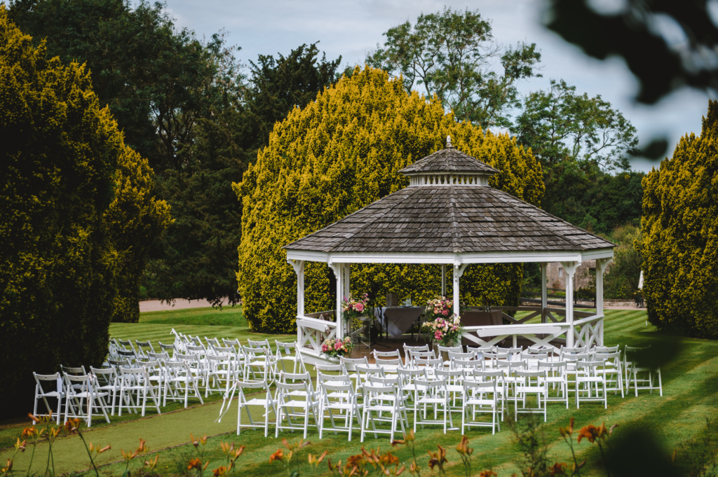 Within ten acres of landscaped parkland, Holmewood Hall combines a Tudor manor with outdoor ceremonies at the bandstand overlooking lawns and water.