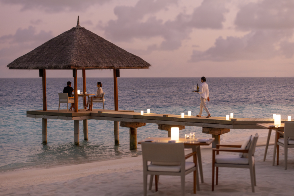 A private island in the Maldives with overwater and beachfront villas, pristine sands, and turquoise lagoons, with the option of exchanging vows on a secluded sandbank.