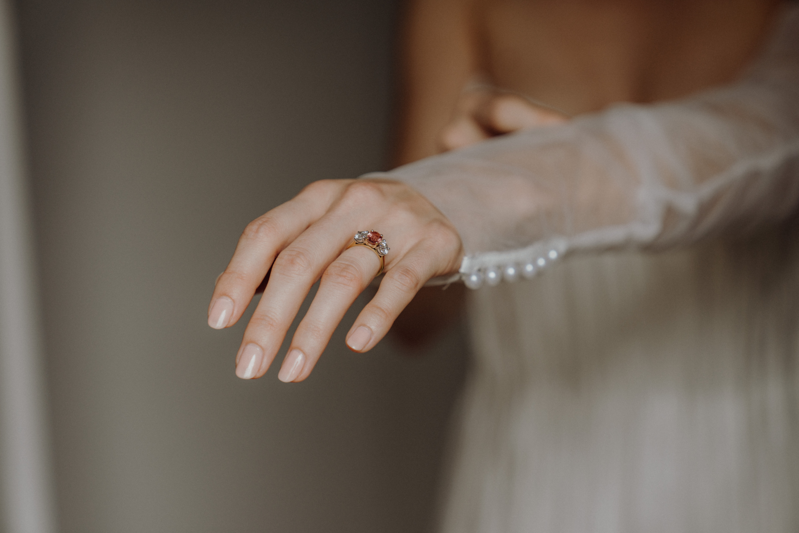 For Charlotte and her fiancé, “it was magical to find someone whose sole purpose was creating something that would be perfect for us. We left feeling genuinely excited about the process and the design,” she says. After an initial telephone briefing, the Blackacre team sourced a variety of gemstones for the couple to choose from – including a selection of rare Padparadscha sapphires from Sri Lanka. With their beautiful peachy-pink colour, these distinctive sapphires captured Charlotte’s heart and she chose a 1.51-carat oval to set at the centre of a three-stone ring, flanked by two diamonds repurposed from heirloom jewellery.